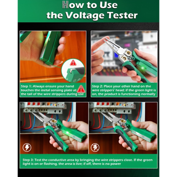 ⚡ Integrierter Spannungsprüfer – prüfen Sie stromführende Schaltkreise sofort, ohne das Werkzeug aus der Hand zu legen
