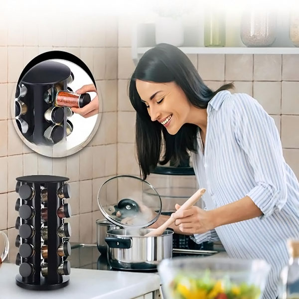 Tento otočný stojan na kořenky vnese do každé kuchyňské sestavy funkčnost i styl.